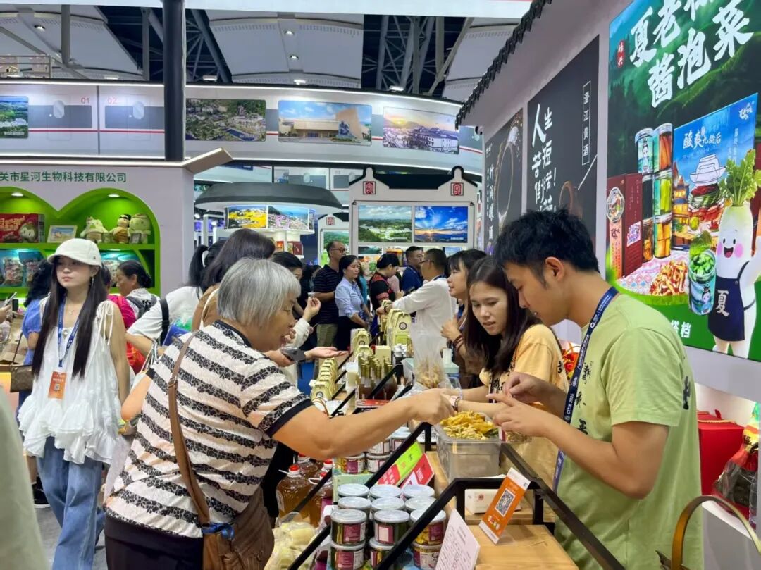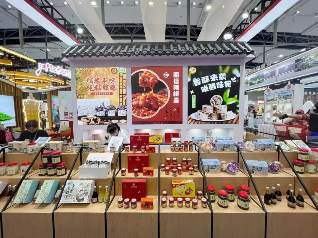 韶关展区以“非遗+科技+文旅”创新融合模式引爆关注,实现好物热销与文化传播双突破。特色美食试吃区人气爆棚,丹霞柴火红豆月饼古法手工制作,韶州联名大米颗粒饱满,竹润娘酒、澄江黄酒等非遗佳酿,与韶美客家米酒系列(桂花酒、玫瑰酒、枇杷酒)香甜醇美,翁源客家米饼酥香松脆,乳源瑶家金线莲养生茶、韶信辣椒酱、夏老板泡菜等,多款农特产品可试喝试吃,吸引观众驻足。