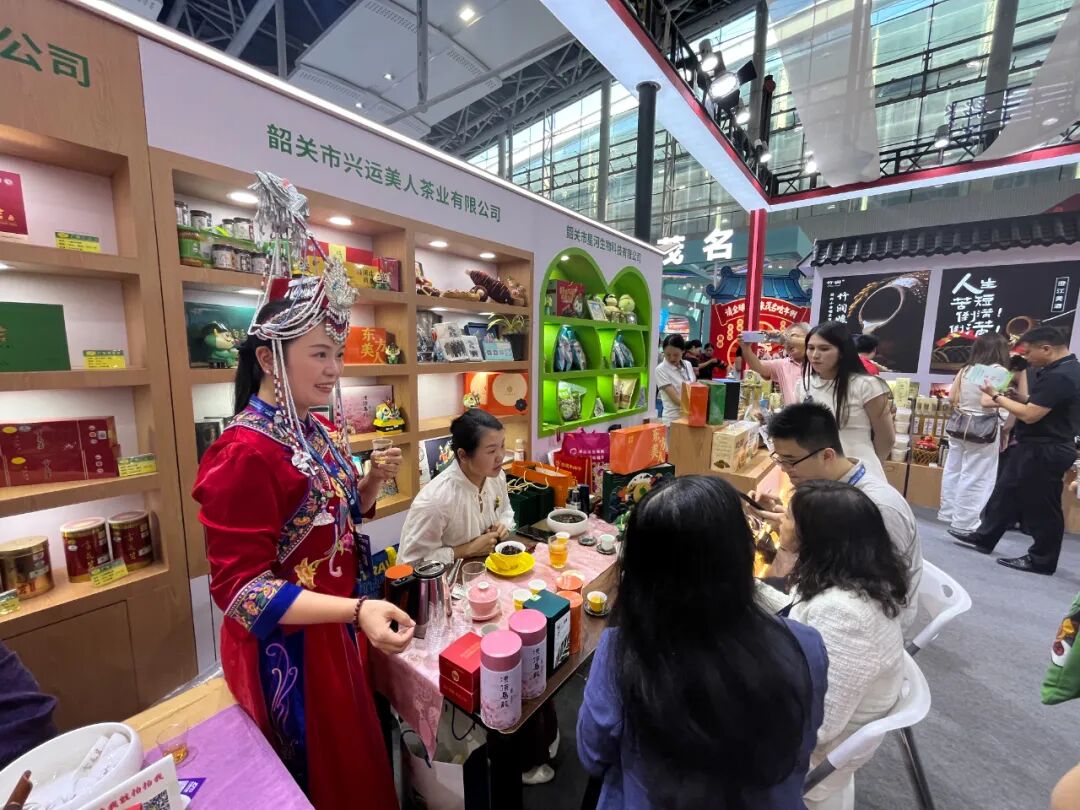 金砂红茶、乐昌白毛茶、雪花岩高山红茶等“韶字号”名茶集体登场,现场品茶区座无虚席,不少游客端着茶杯细细品味,茶香袅袅中不时传来“这个回甘太绝了”“买两盒送朋友”的热议。韶关茶也成为现场观众争相带走的“韶关记忆”之一,掀起现场购茶热潮。